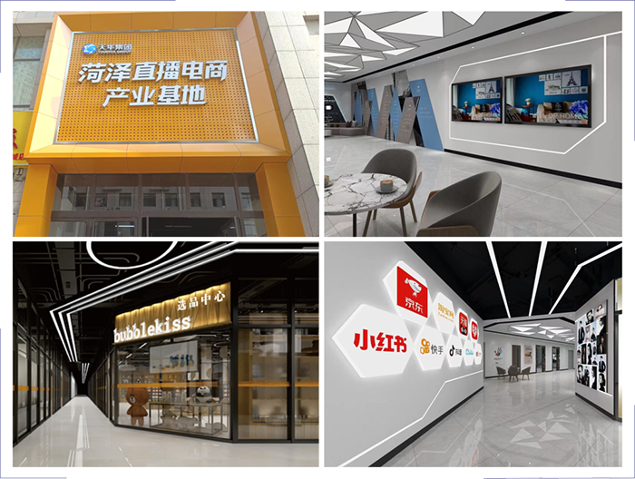 山东天华电商直播基地(天华电商产业园)是集网商创业孵化、众创空间、电子商务、新媒体广告、线下体验、仓储物流、分拨配送及综合配套为一体的全功能、全要素电商产业园区。通过直播电商开辟了菏泽市传统特色商品的销售新渠道,重点展示和推广菏泽市丰富的农特产品、风味土特产、老字号、手工艺品和特色旅游资源,宣传带动当地特色文化产业发展,进一步提升菏泽市城市知名度,促进经济、农业、旅游和电子商务的融合协调发展。目前园区“特色中国﹒菏泽馆”经过进一步提档升级,已成为全市电商直播供应链基地,拥有高标准直播间14个,签约品牌2600多个,汇集特色产品3000余种,配备了一支集直播销售、线上推广、视频拍摄、主播培训、供应链聚集等五位一体的高标准网红直播运营团队。