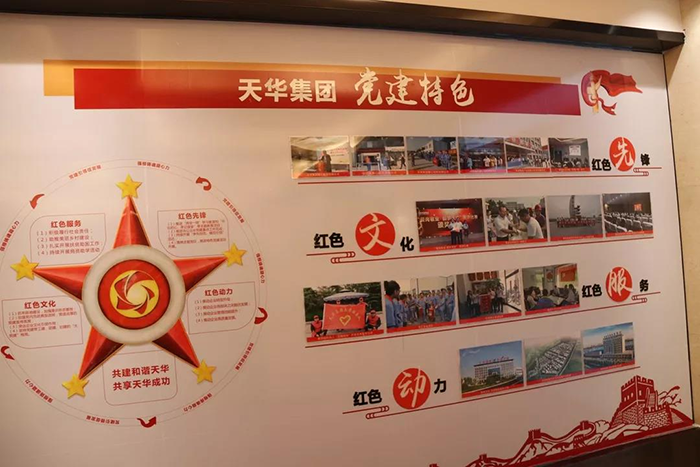 天华集团党委成立于2016年,下设3个党总支、11个党支部,正式党员112人。自成立以来,集团党委坚定不移地贯彻落实中央关于加强非公党建的系列精神,创新党建模式,充分发挥两个作用,扎实开展党建工作。天华电商产业园党总支先后被省、市、区评为优秀先进基层党组织;天荣家居有限公司党总支2018年被市委组织部确定为全市非公有制经济组织党建工作示范点。2019年以来,天华集团按照全市八大“红色品牌 ”三年行动计划方案要求,深入实施“红色堡垒”品牌创建工程。在“红色堡垒”引领,突出“红色文化”“红色动力”“红色先锋”“红色服务”四大“亮点动作”,进一步加强广大党员党性教育,增强各级党组织创造力、战斗力和凝聚力,推动党建工作与企业经营融合发展。