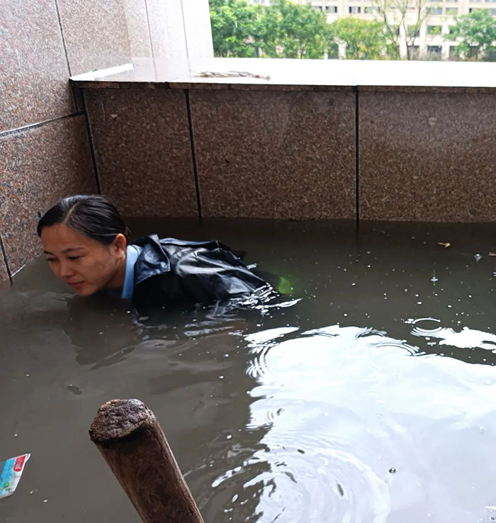 暴雨来袭,在巡查过程中,她发现一处窗台积水无法顺利排出,水流马上倒灌进室内,在这紧急的时刻,她毅然跳入污水中,在冰冷污秽的积水中泡了将近两个小时,直到堵塞的位置排水顺畅,排除隐患,小小的身躯隐藏了大大的能量。也正是这毫不犹豫的纵身一跳,让她成为同事心目中“最美的项目经理”。