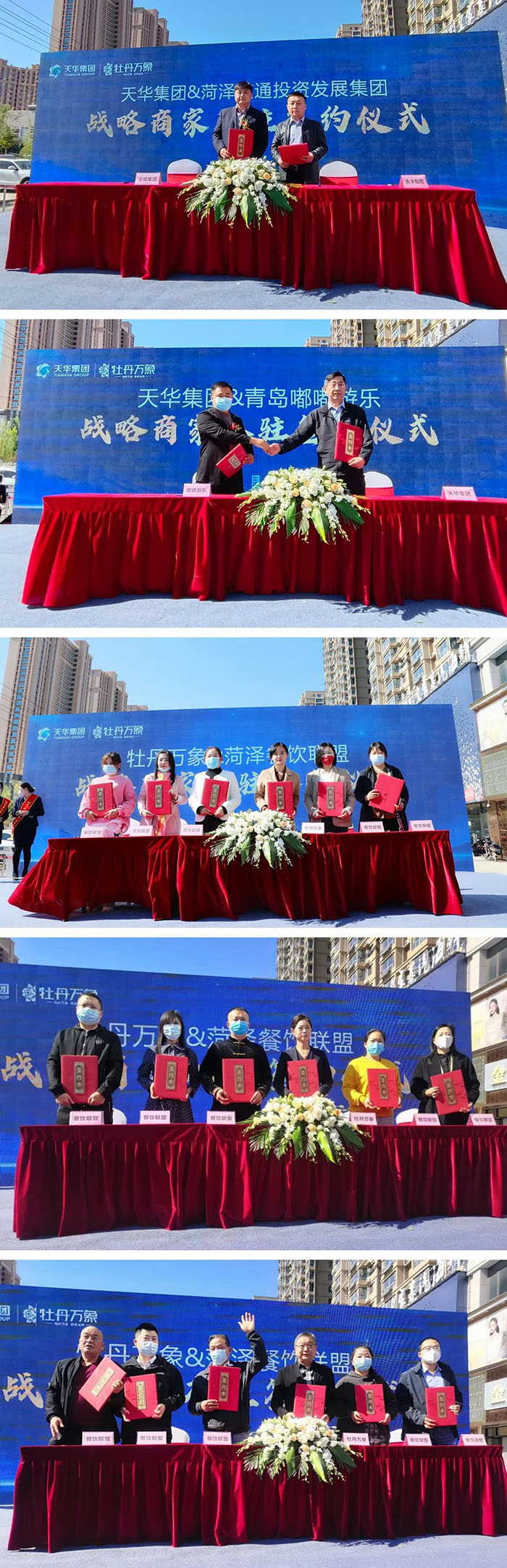 在全场领导嘉宾的共同见证下,天华集团相关领导分别与菏泽交投集团、青岛嘟嘟游乐以及菏泽餐饮联盟商家代表进行隆重签约,标志着牡丹万象57家战略商家正式签约入驻,不仅为牡丹万象建设注入新活力和新动能,也将推动牡丹万象及周边片区进入一个全新的发展阶段。
