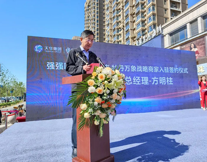 天华集团副总经理方明柱在致辞中介绍了天华集团及牡丹万象项目基本情况。他指出,此次签约活动中,菏泽交投集团旗下立喜禾悦生活超市以及青岛嘟嘟游乐打造的家庭亲子乐园分别签约入驻万象商业广场一层和二层,菏泽餐饮联盟55家品牌餐饮店和网红联盟签约入驻万象网红美食街。天华集团不仅为入驻企业、商家提供较大力度的扶持政策,也将利用菏泽市直播电商产业基地资源优势,通过直播赋能,带动传统餐饮业、商贸业实现创新发展。